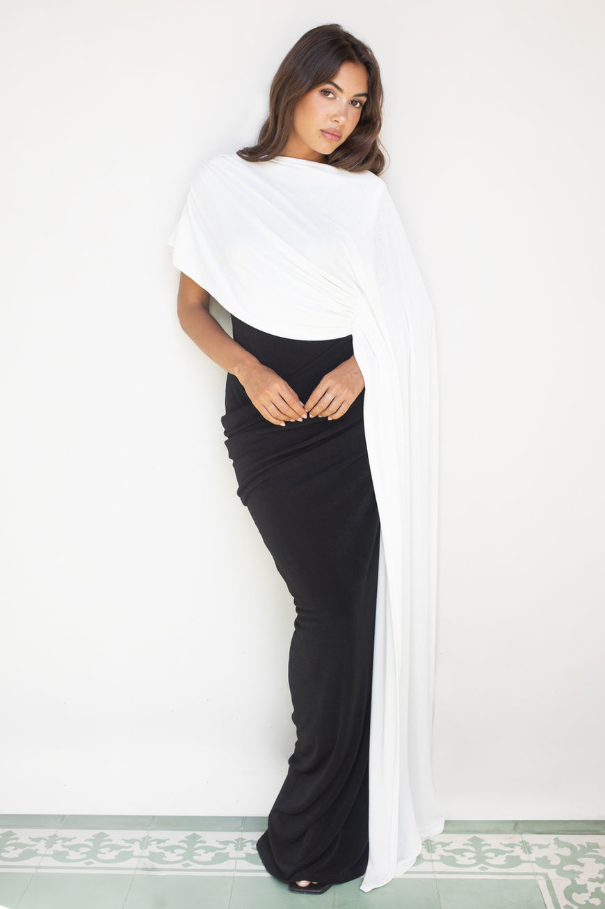 In a timeless contrast of black and ivory, Zahra embodies understated luxury. Her two-tone palette highlights the graceful flow of the cape, while the underdress remains sleek, form-enhancing and versatile. Zahra is cut from our staple shimmery soft fabric. She's a must have!